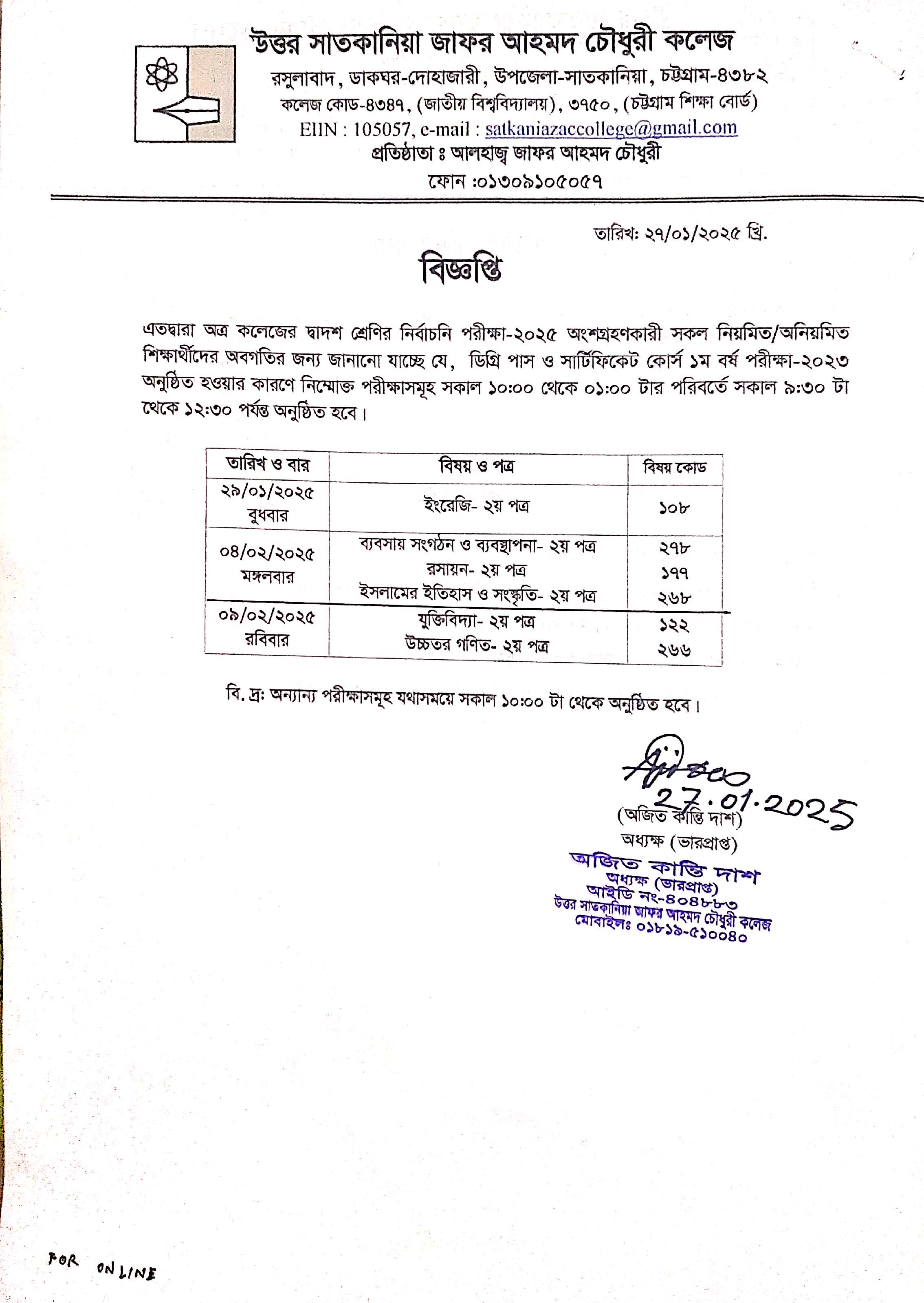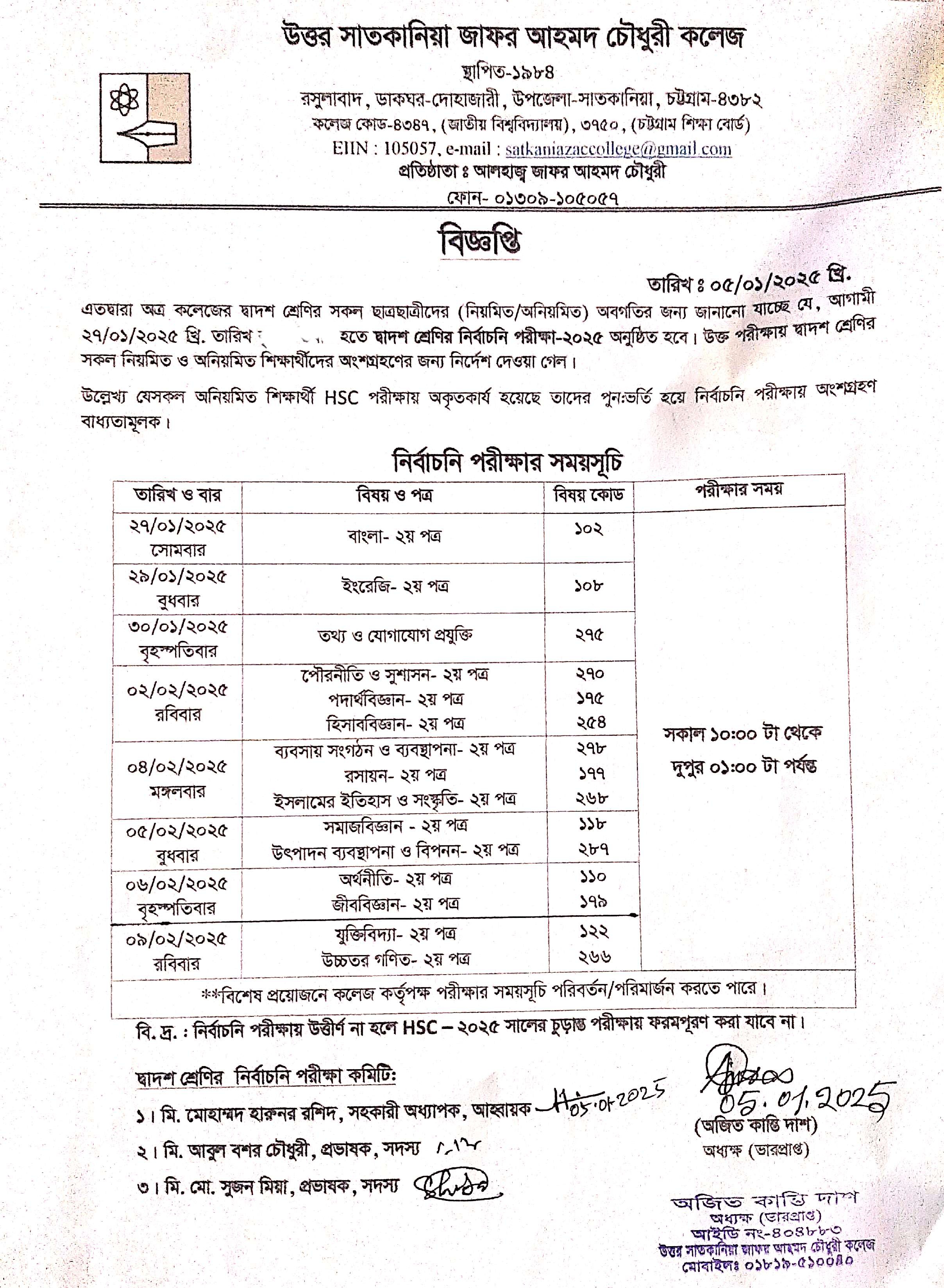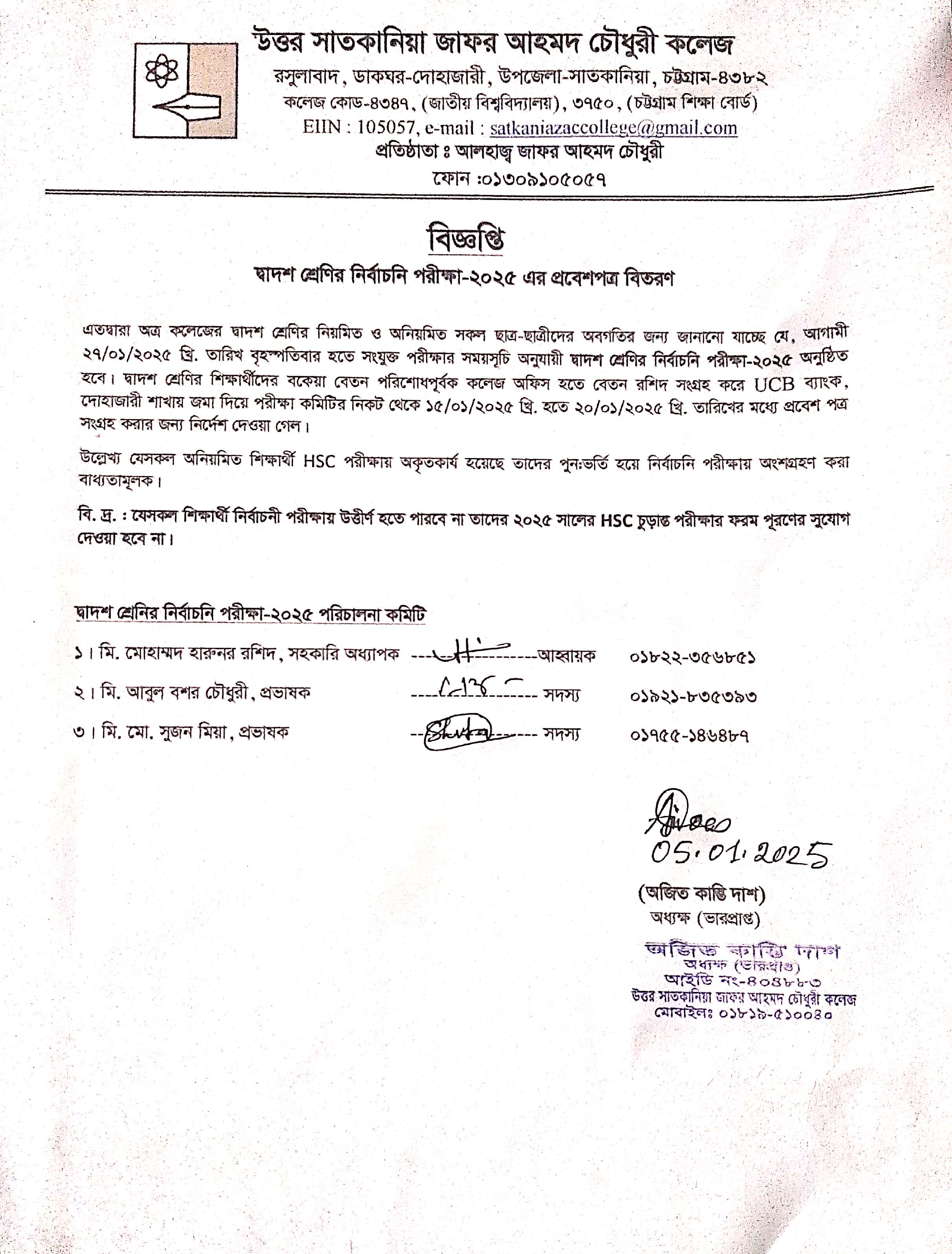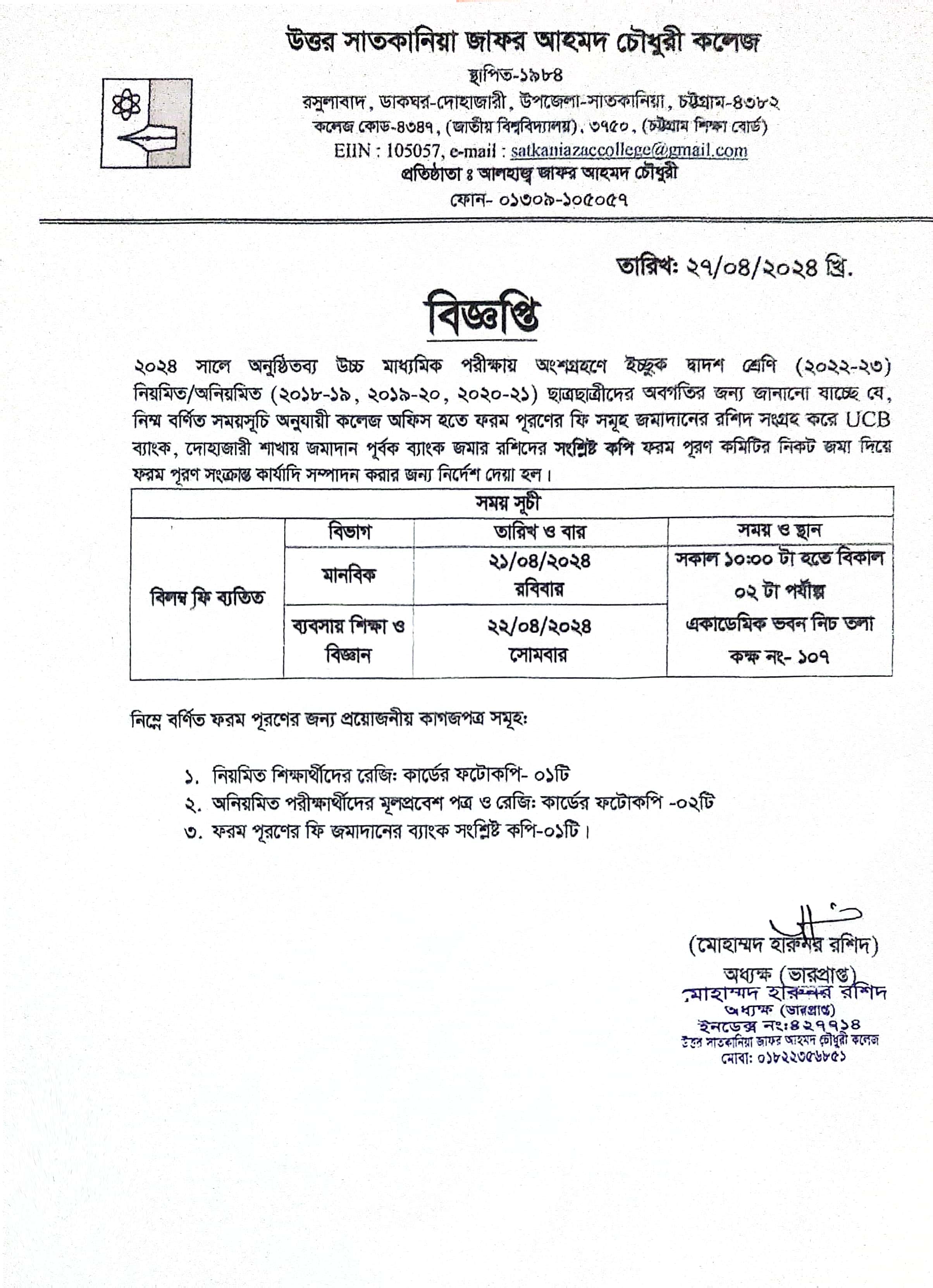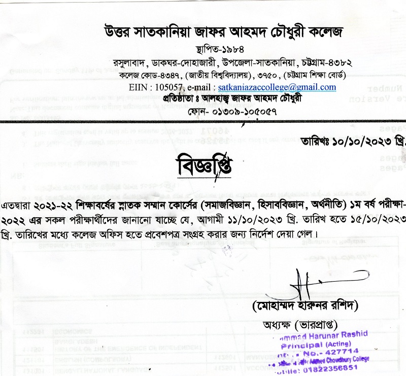 College Code : 4347 Rasulabad, PO: - Dohazari,, Satkania, Chattogram; 01309-105057