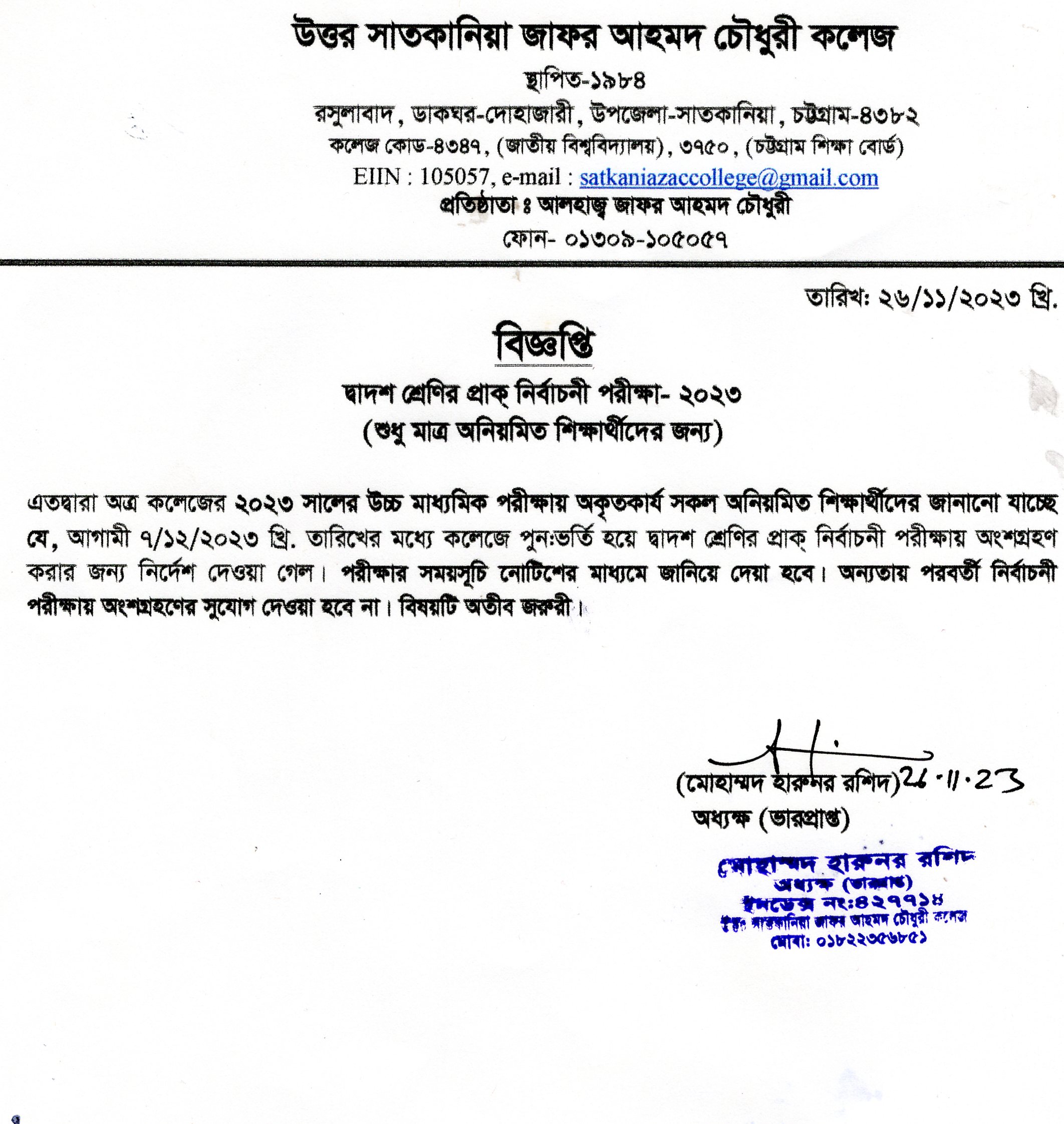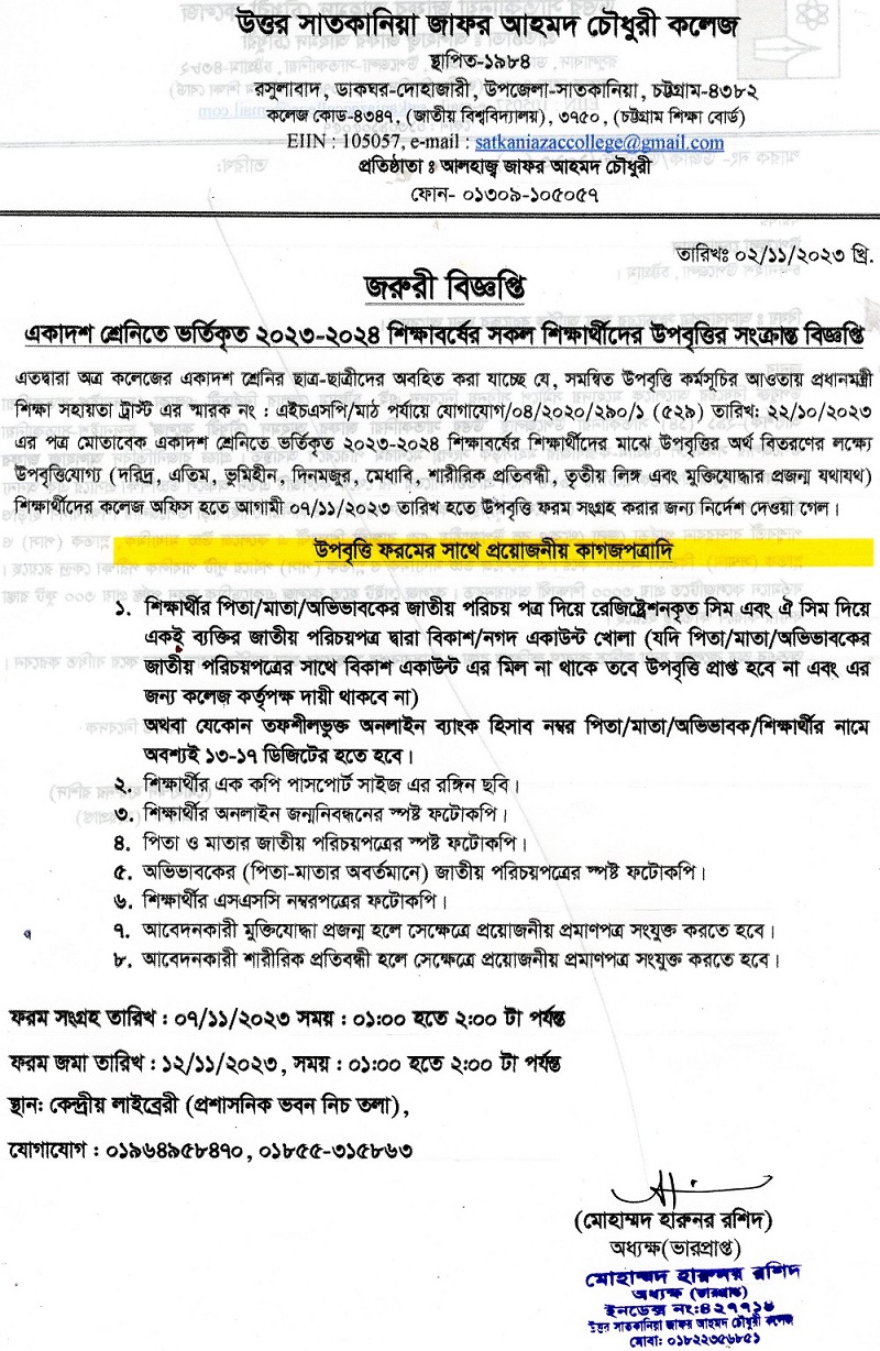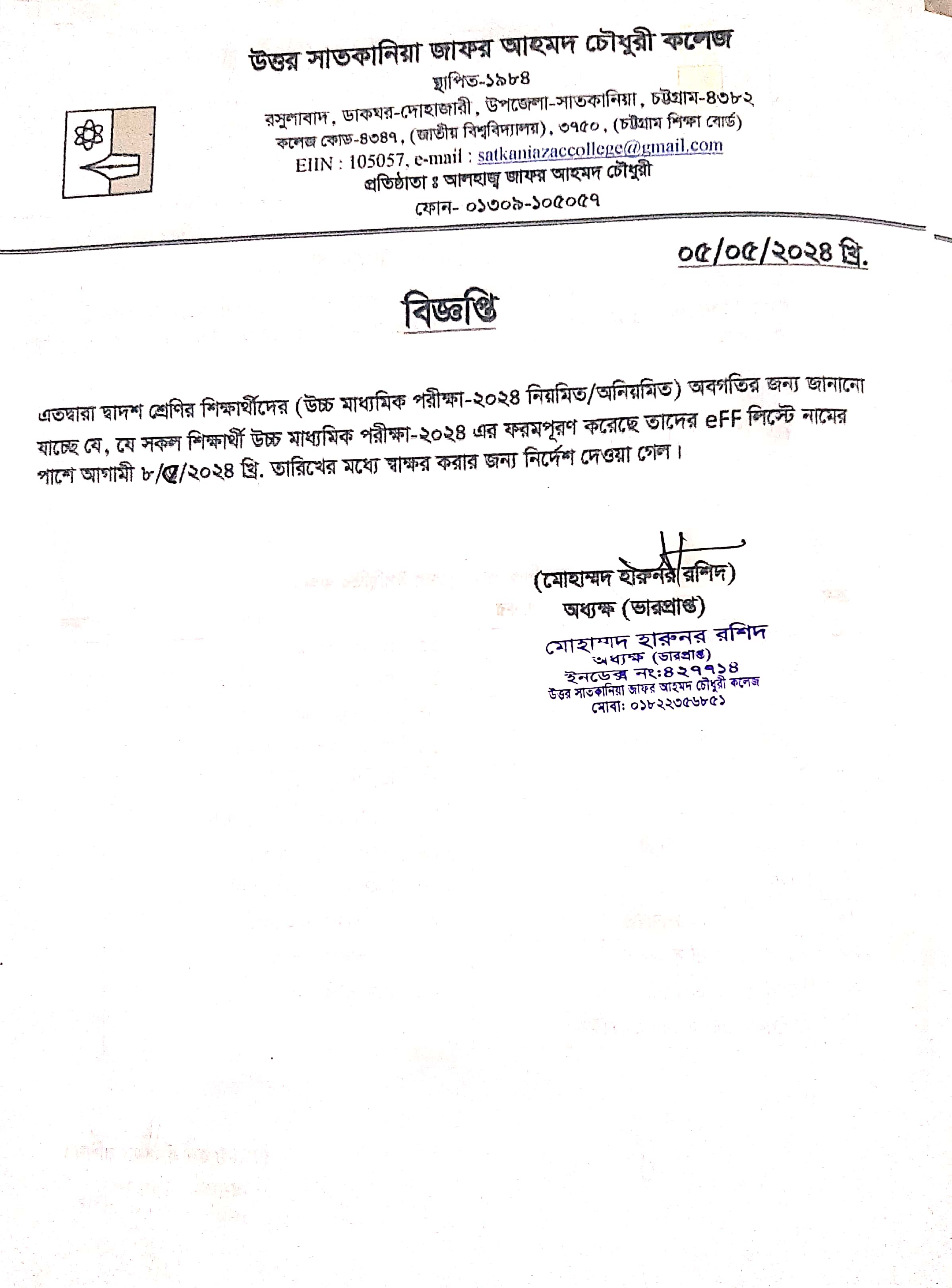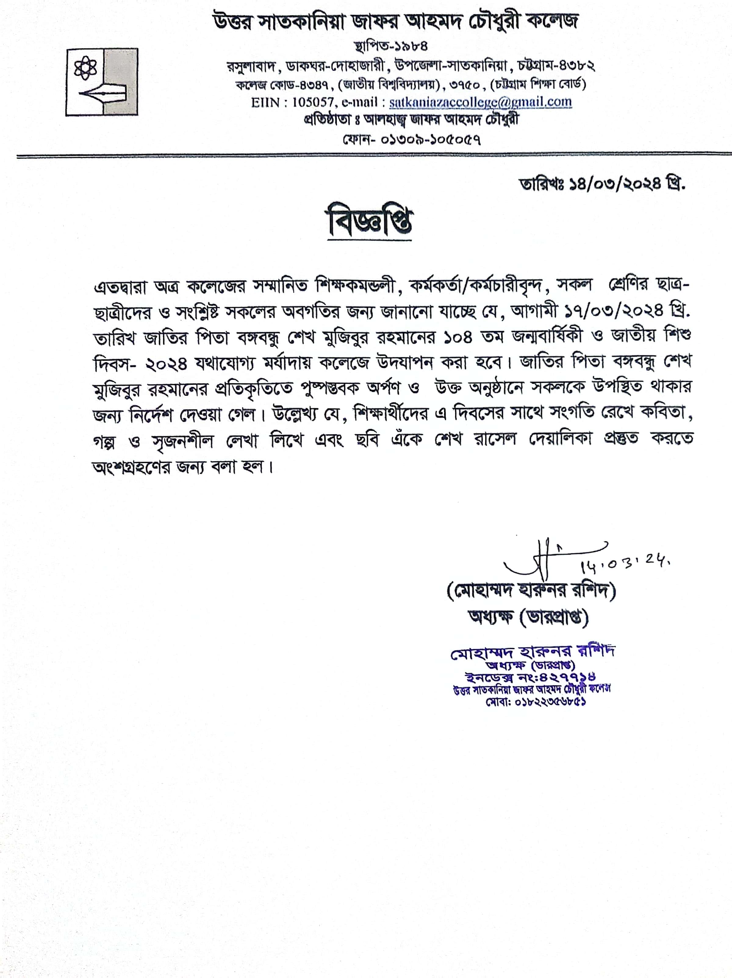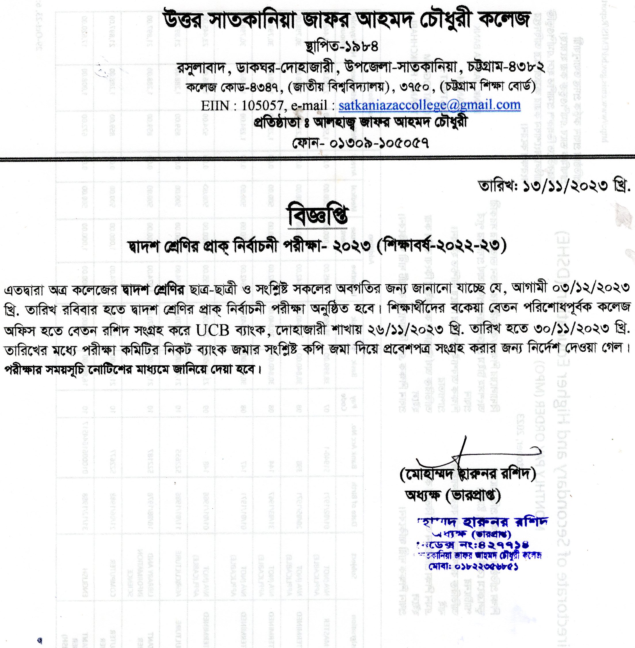 College Code : 4347 Rasulabad, PO: - Dohazari,, Satkania, Chattogram; 01309-105057