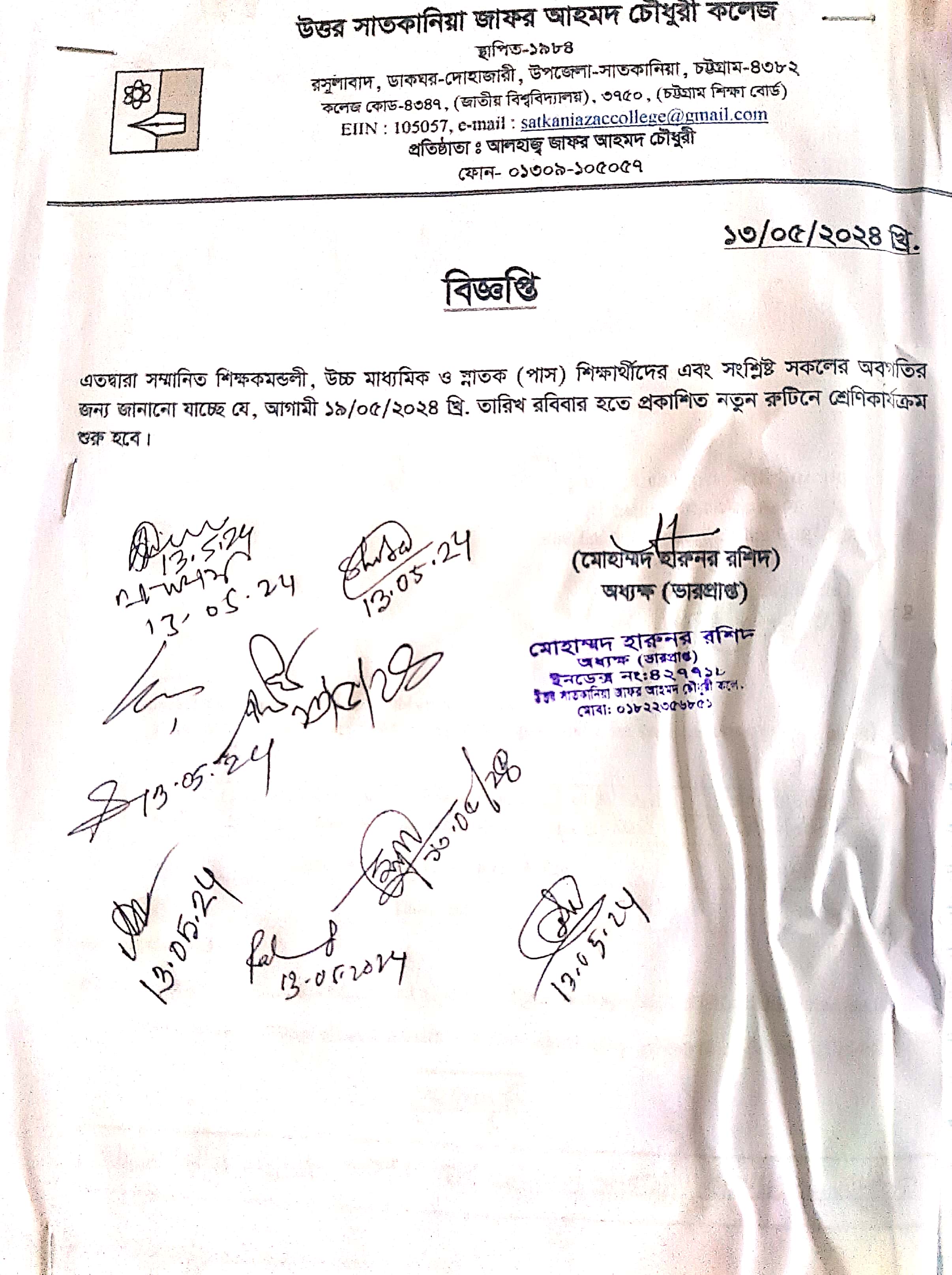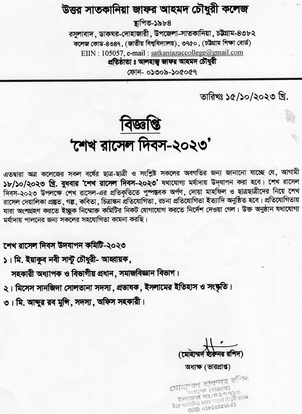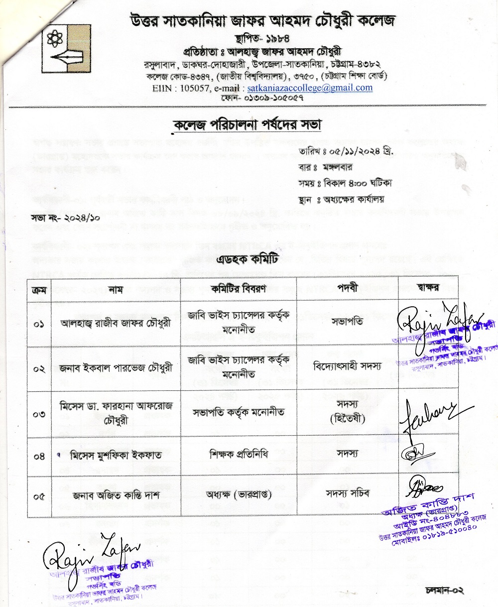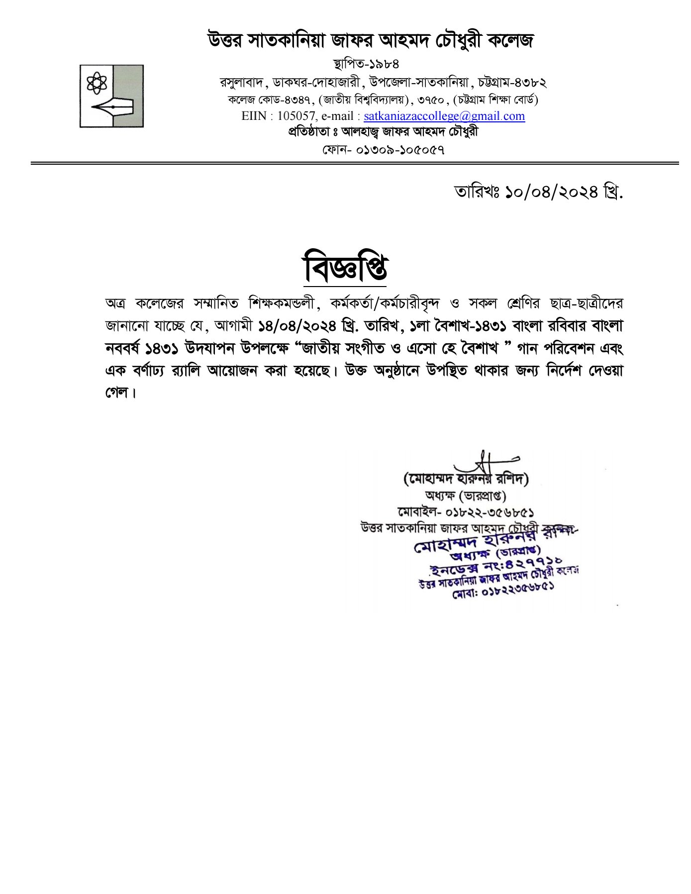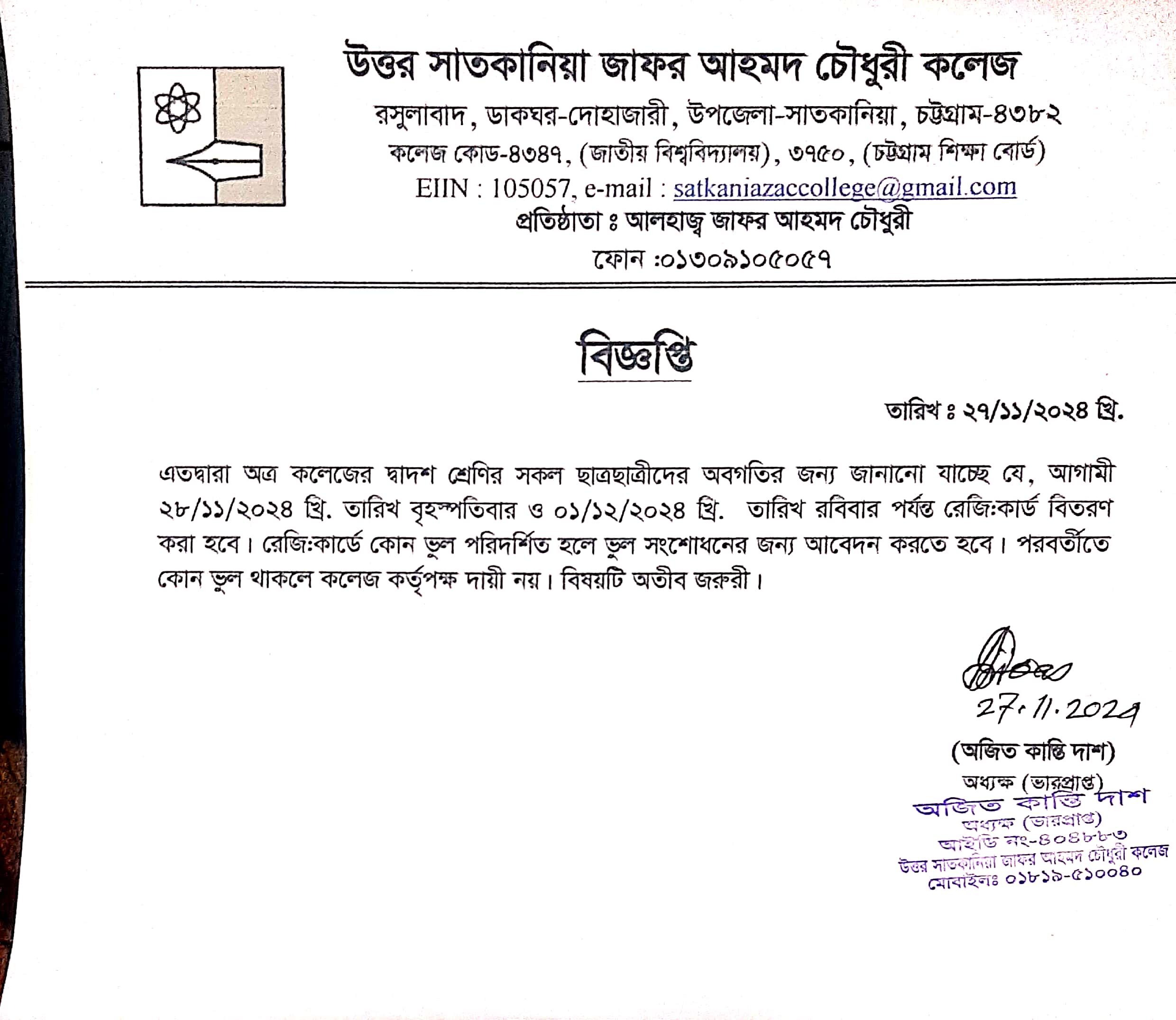 College Code : 4347 Rasulabad, PO: - Dohazari,, Satkania, Chattogram; 01309-105057