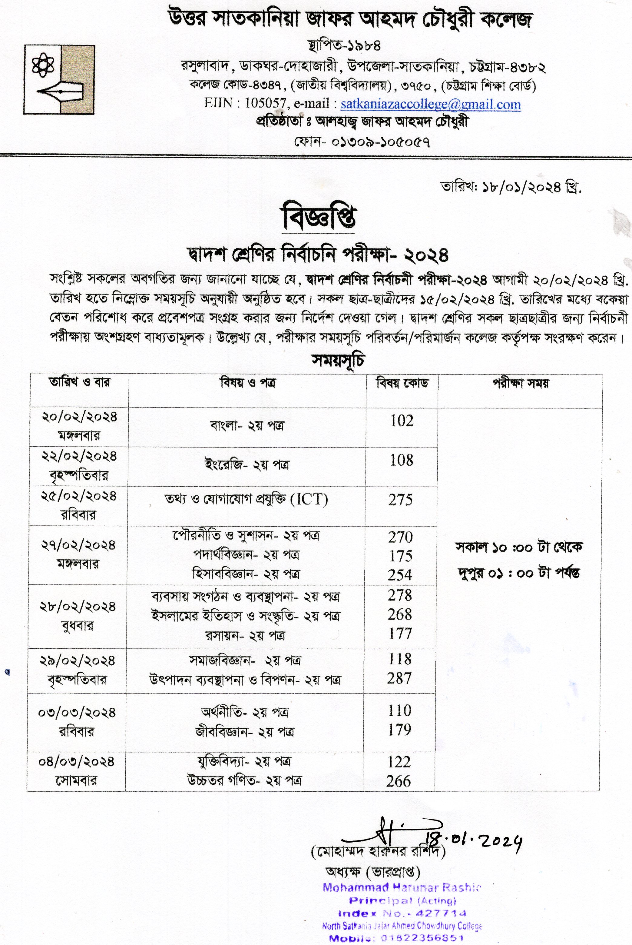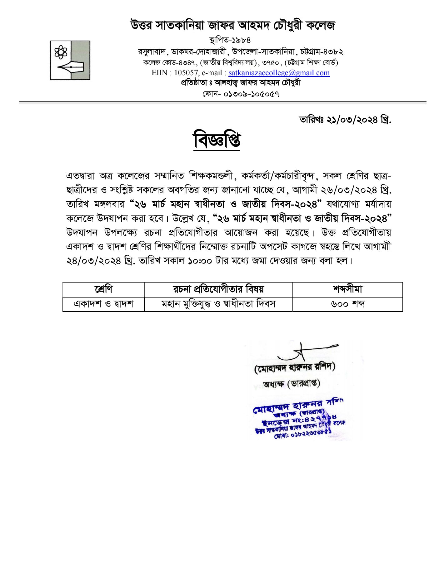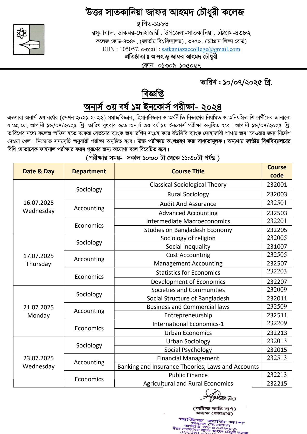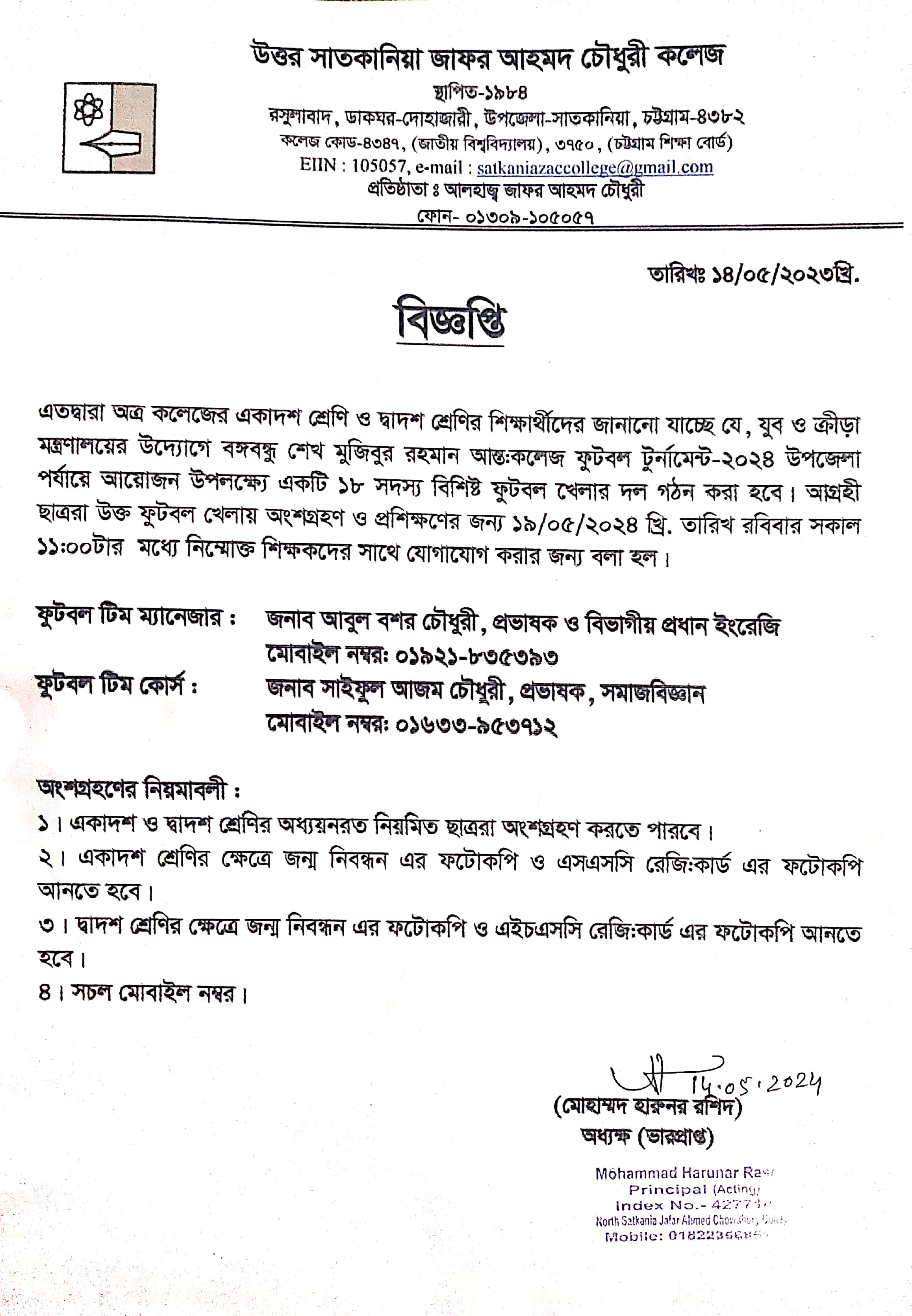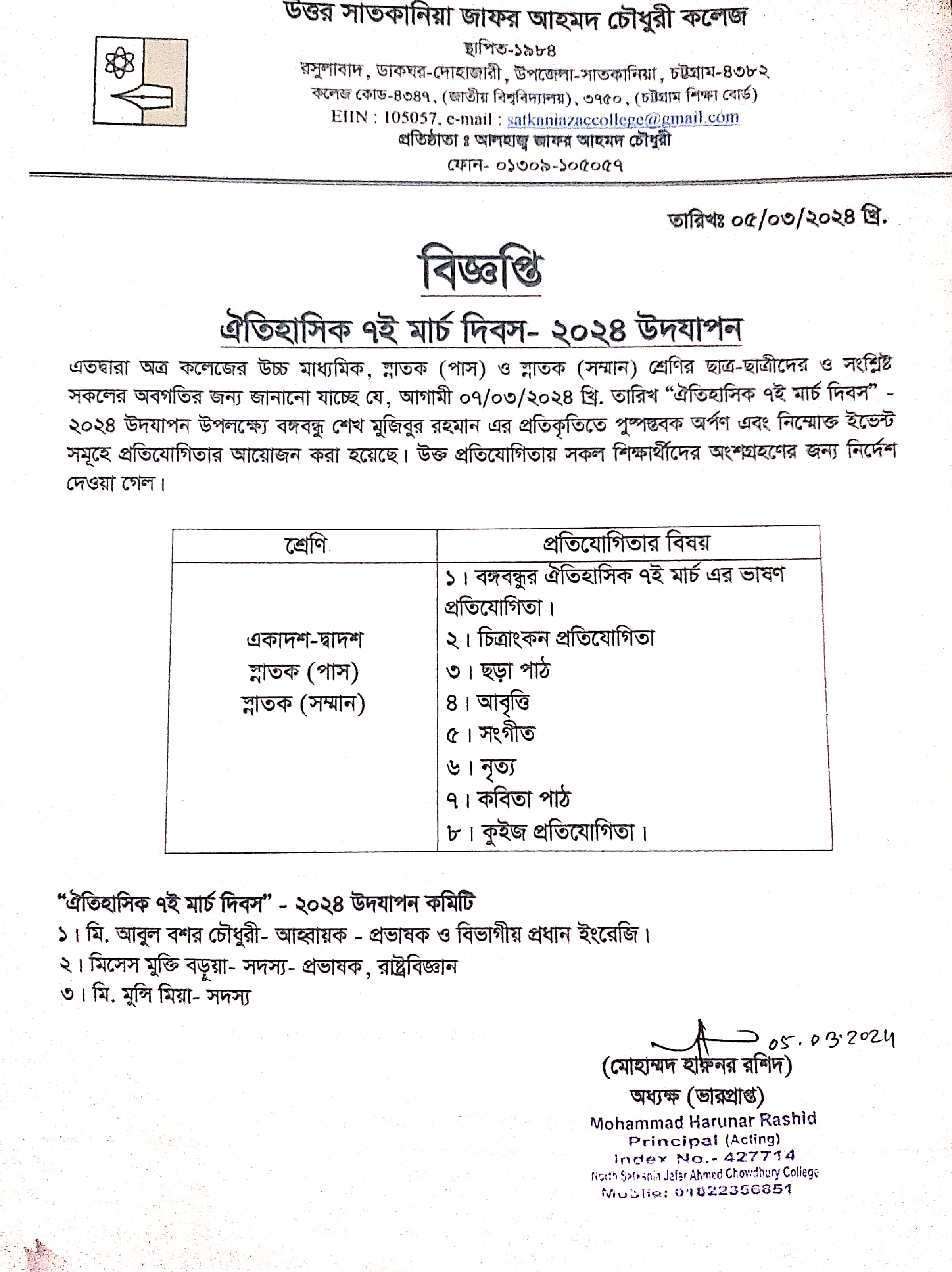 College Code : 4347 Rasulabad, PO: - Dohazari,, Satkania, Chattogram; 01309-105057