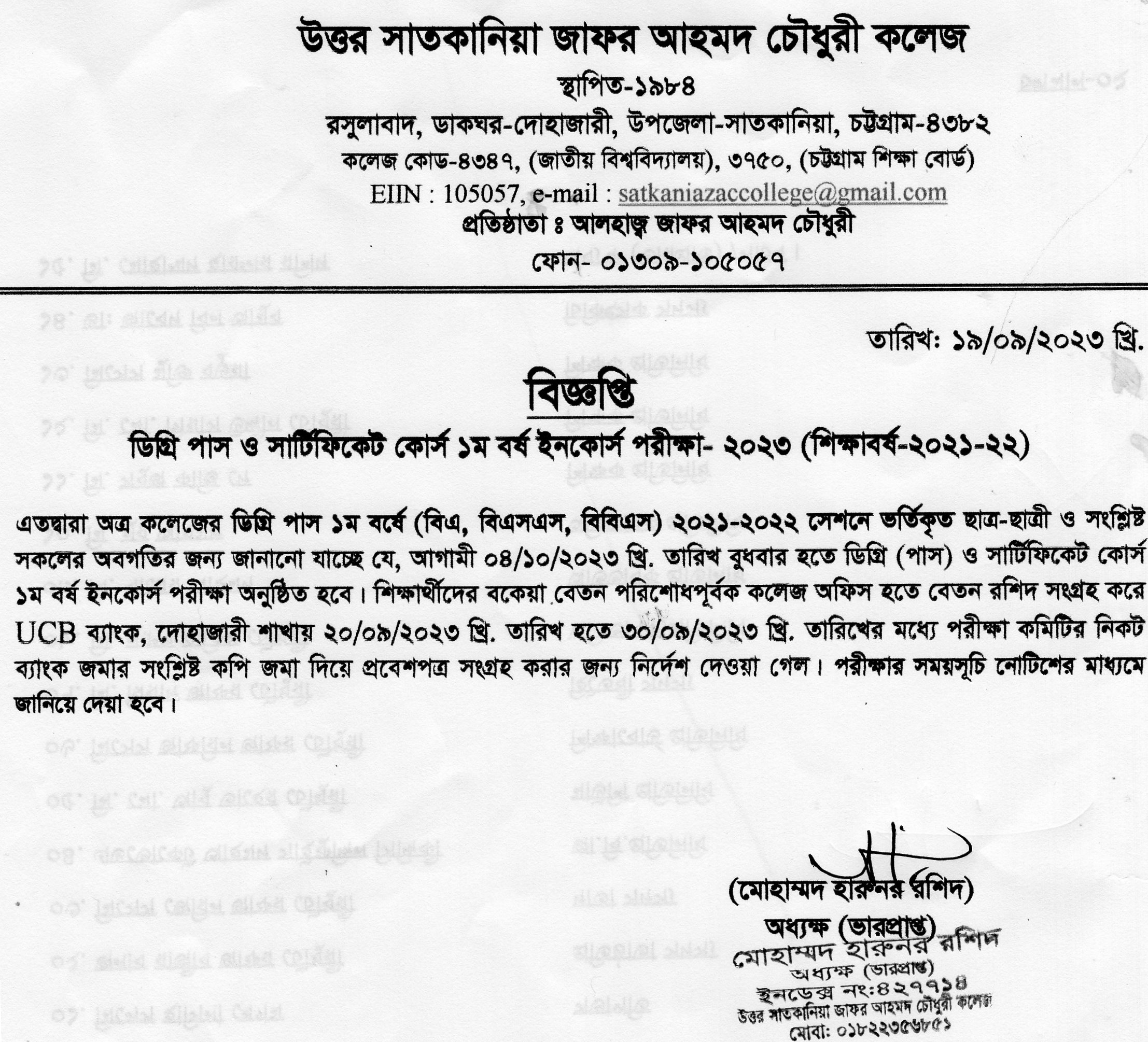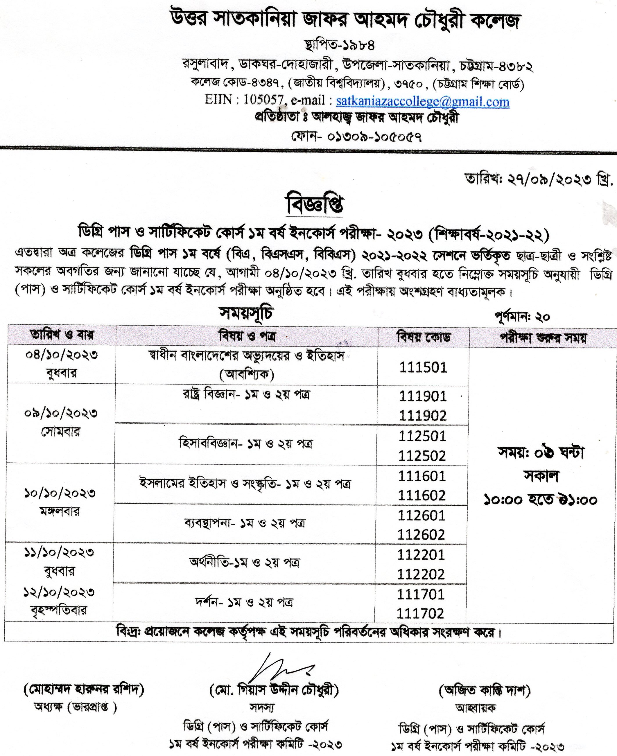 09/19/2023 ডিগ্রি পাস ও সার্টিফিকেট কোর্স প্রথম বর্ষের ইনকোর্স পরীক্ষার বিজ্ঞপ্তি।