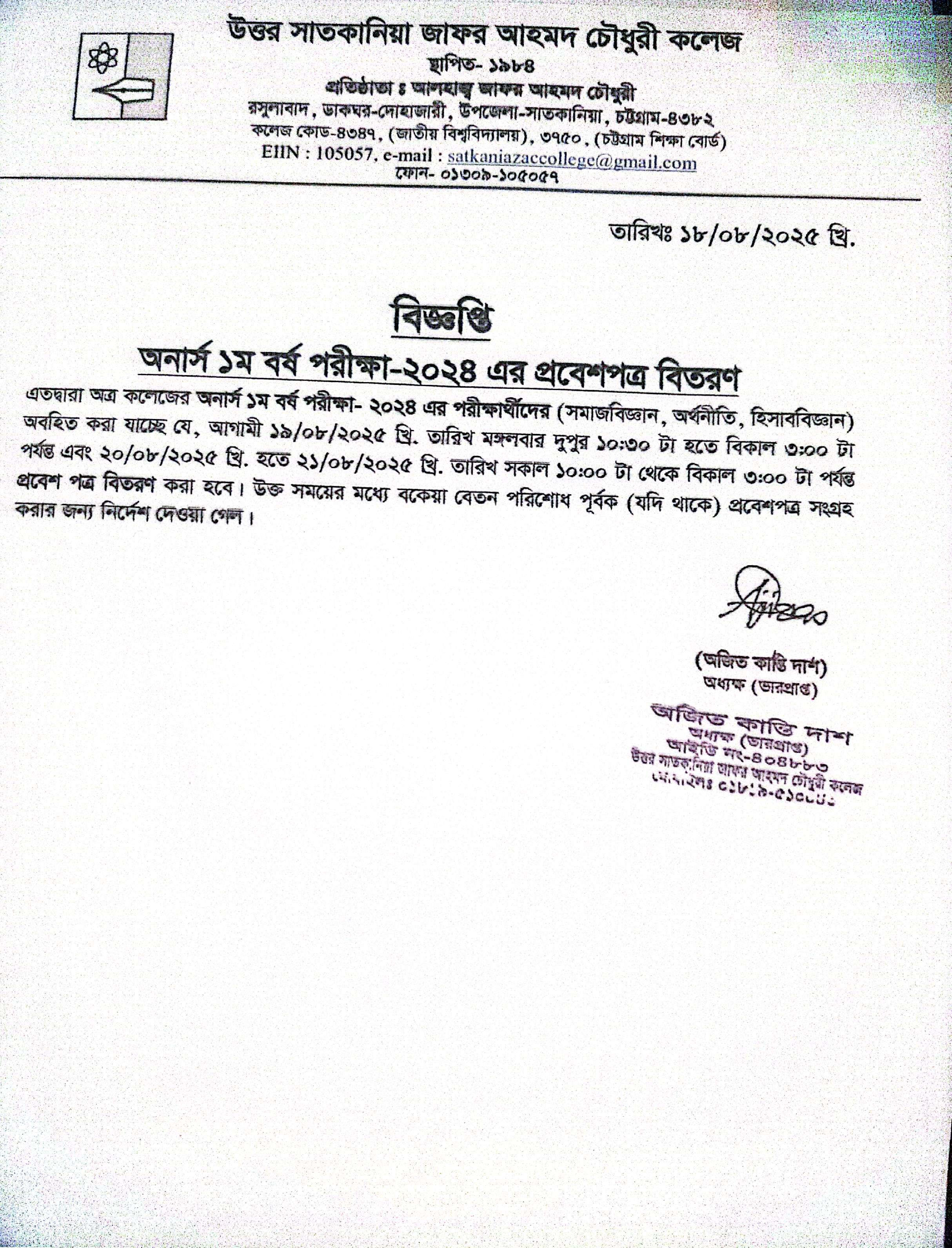 08/18/2025 অনার্স প্রথম বর্ষ পরীক্ষা ২০২৪ এর প্রবেশপত্র বিতরণ প্রসঙ্গে