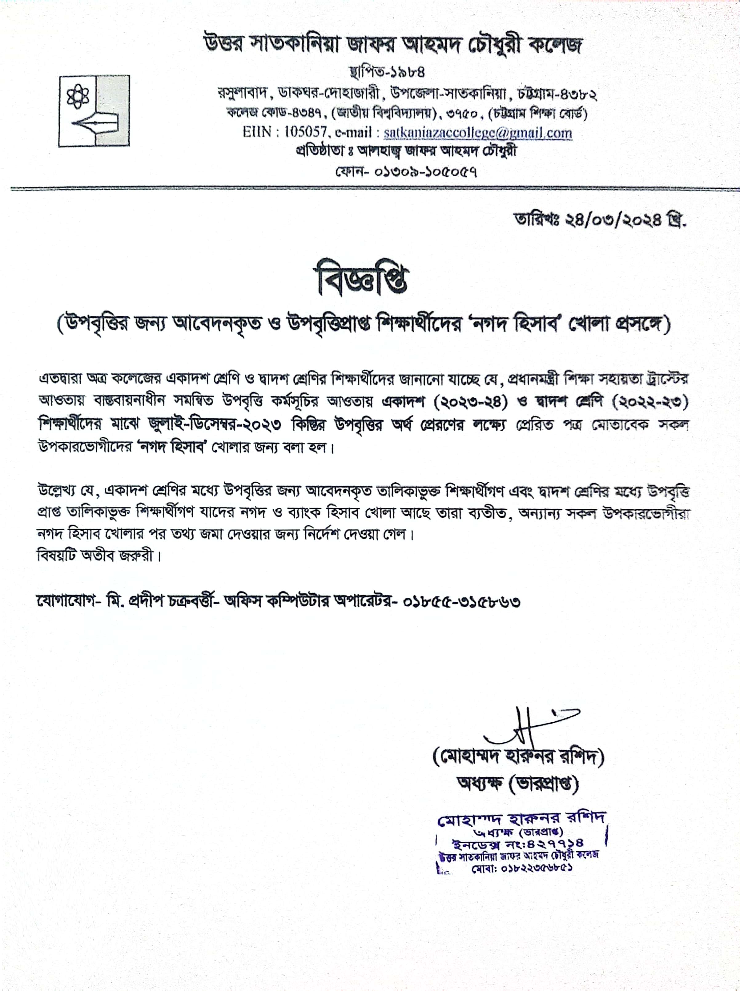 04/22/2024 একাদশ ও দ্বাদশ শ্রেণীর উপবৃত্তির জন্য নগদ হিসাব খোলা প্রসঙ্গে বিজ্ঞপ্তি