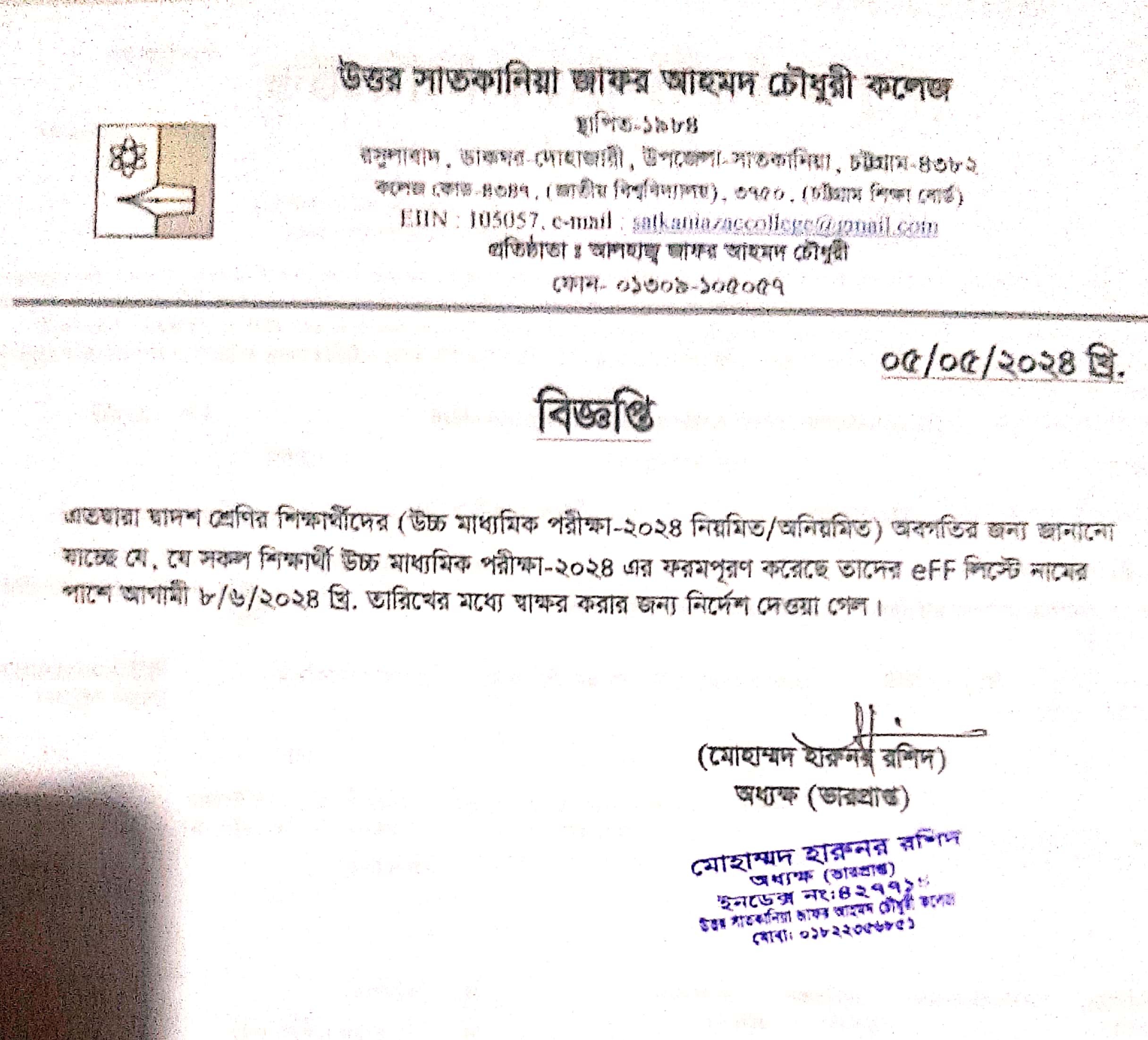 05/05/2024 উচ্চ মাধ্যমিক পরীক্ষায় ফরম পূরণকৃত তালিকায় স্বাক্ষর প্রদান প্রসঙ্গে