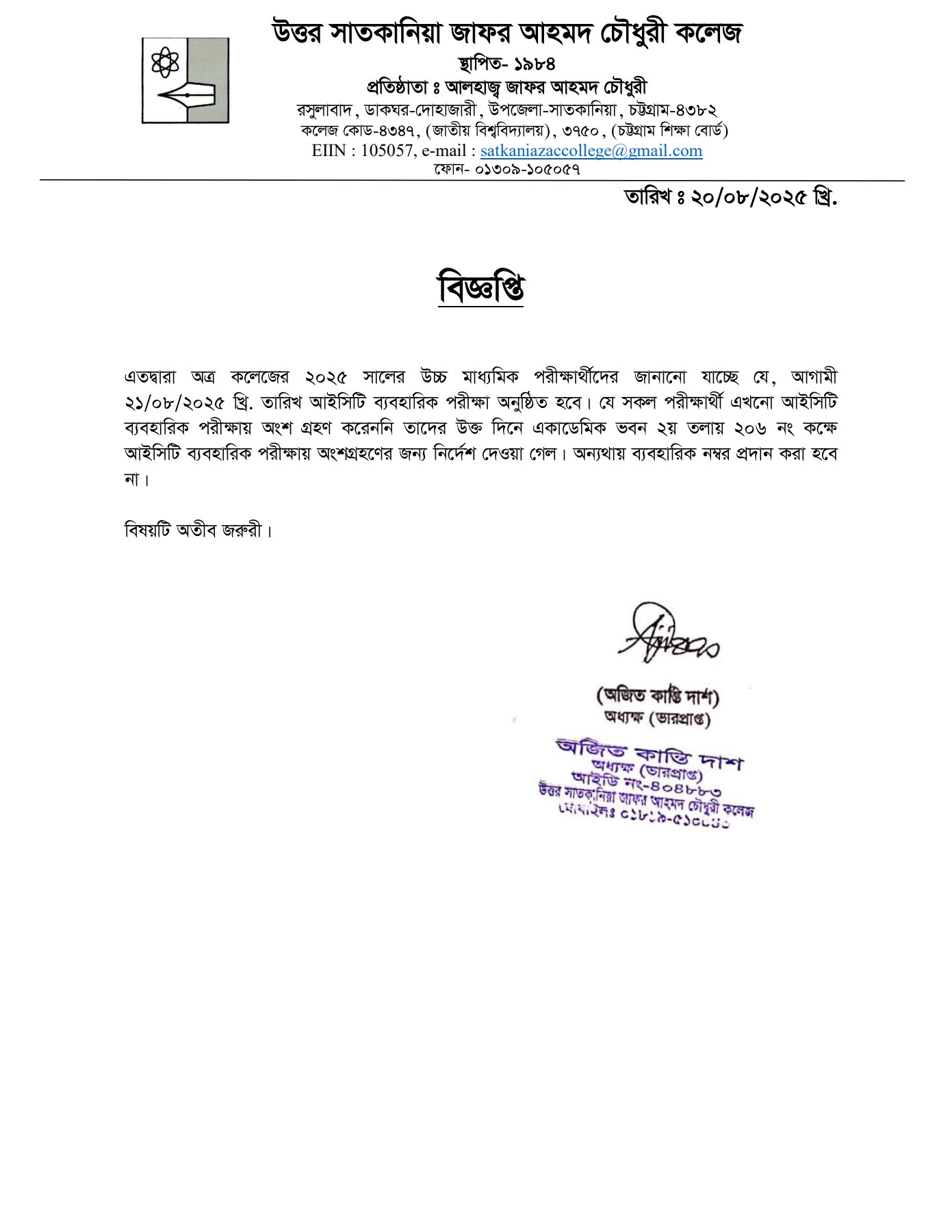08/20/2025 আইসিটি ব্যবহারিক পরীক্ষা সংক্রান্ত বিজ্ঞপ্তি