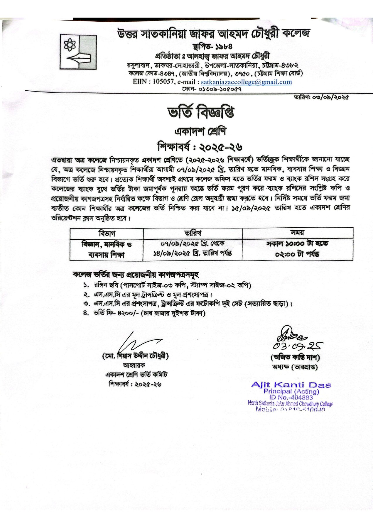 09/03/2025 একাদশ শ্রেণীর ভর্তি বিজ্ঞপ্তি ২০২৫