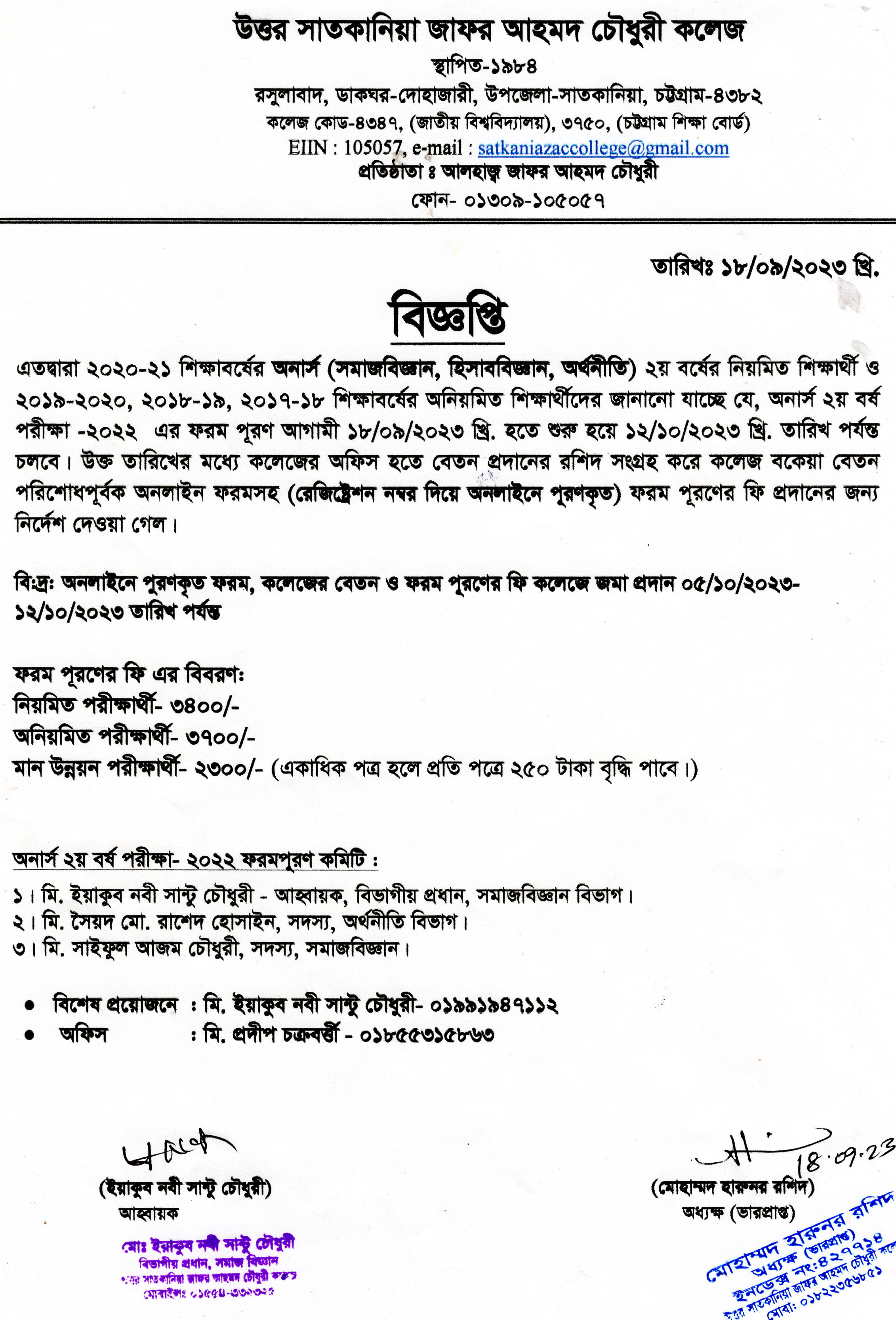 09/24/2023 অনার্স দ্বিতীয় বর্ষের ফরম পূরণ বিজ্ঞপ্তি