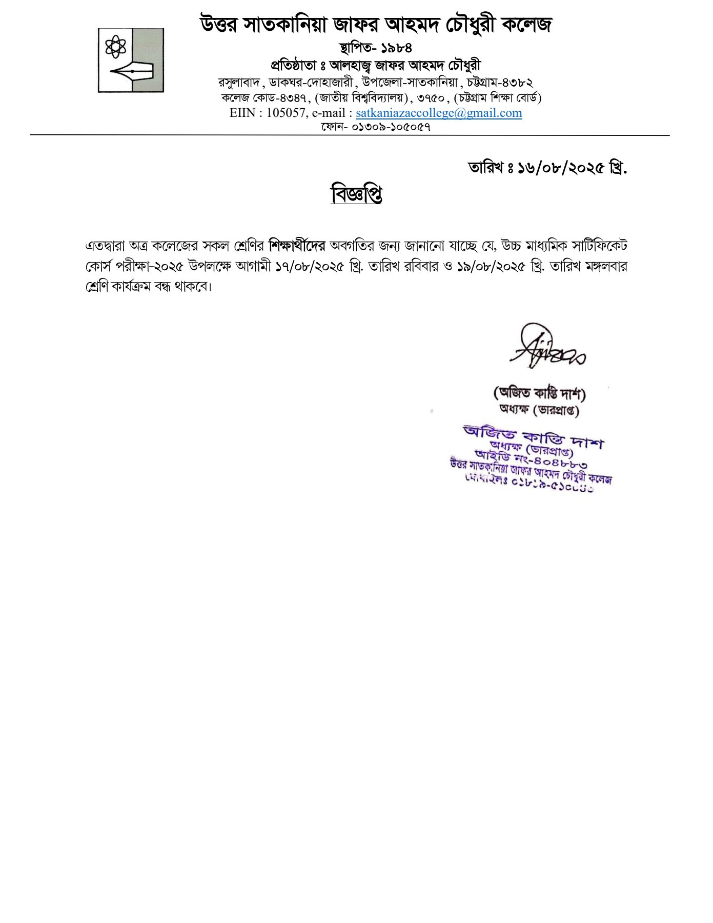 08/16/2025 উচ্চ মাধ্যমিক পরীক্ষা উপলক্ষে শ্রেণী কার্যক্রম বন্ধ প্রসঙ্গে।