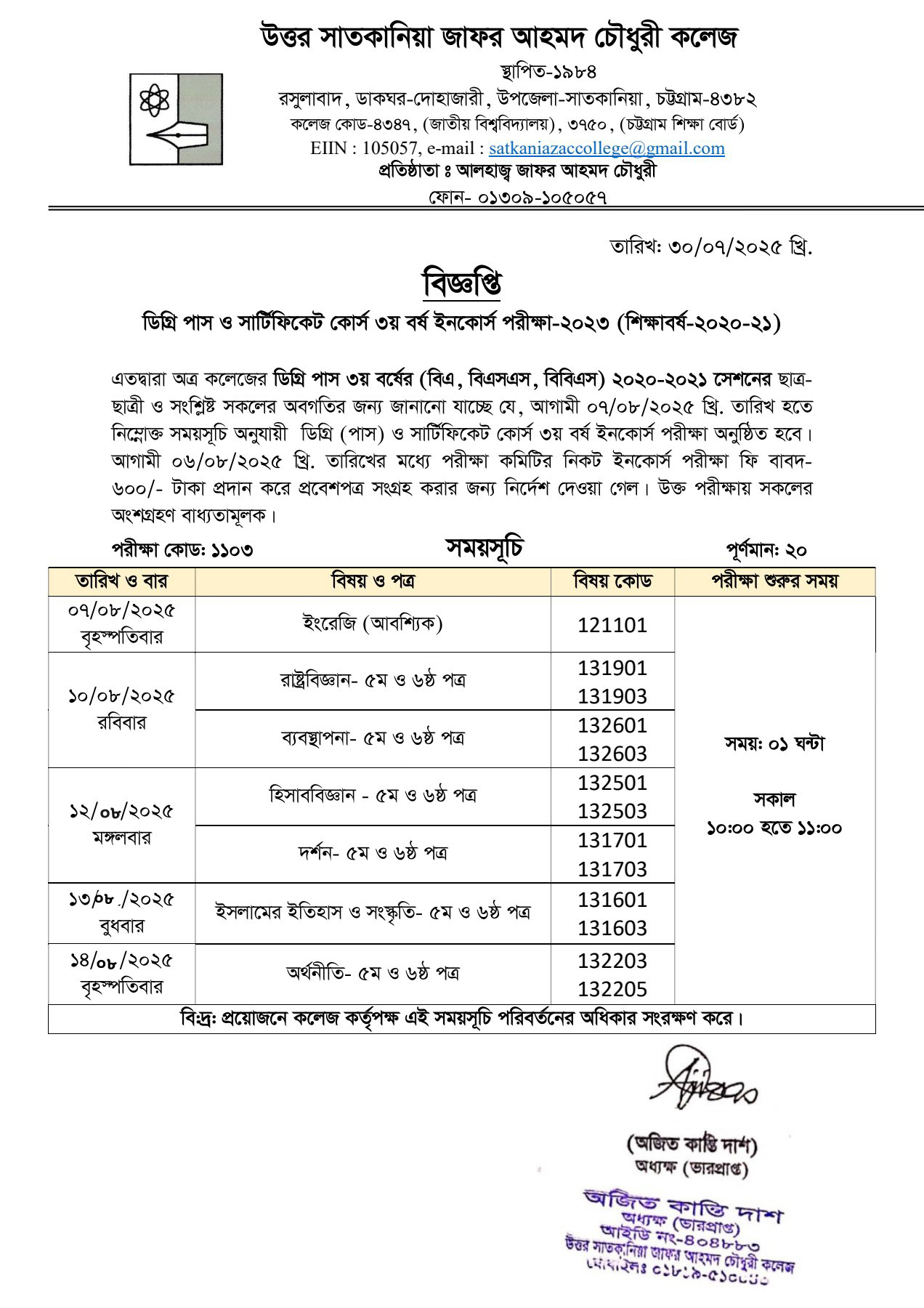 07/30/2025 ডিগ্রি পাস ও সার্টিফিকেট কোর্স তৃতীয় বর্ষ ইনকোর্স পরীক্ষার সময়সূচি