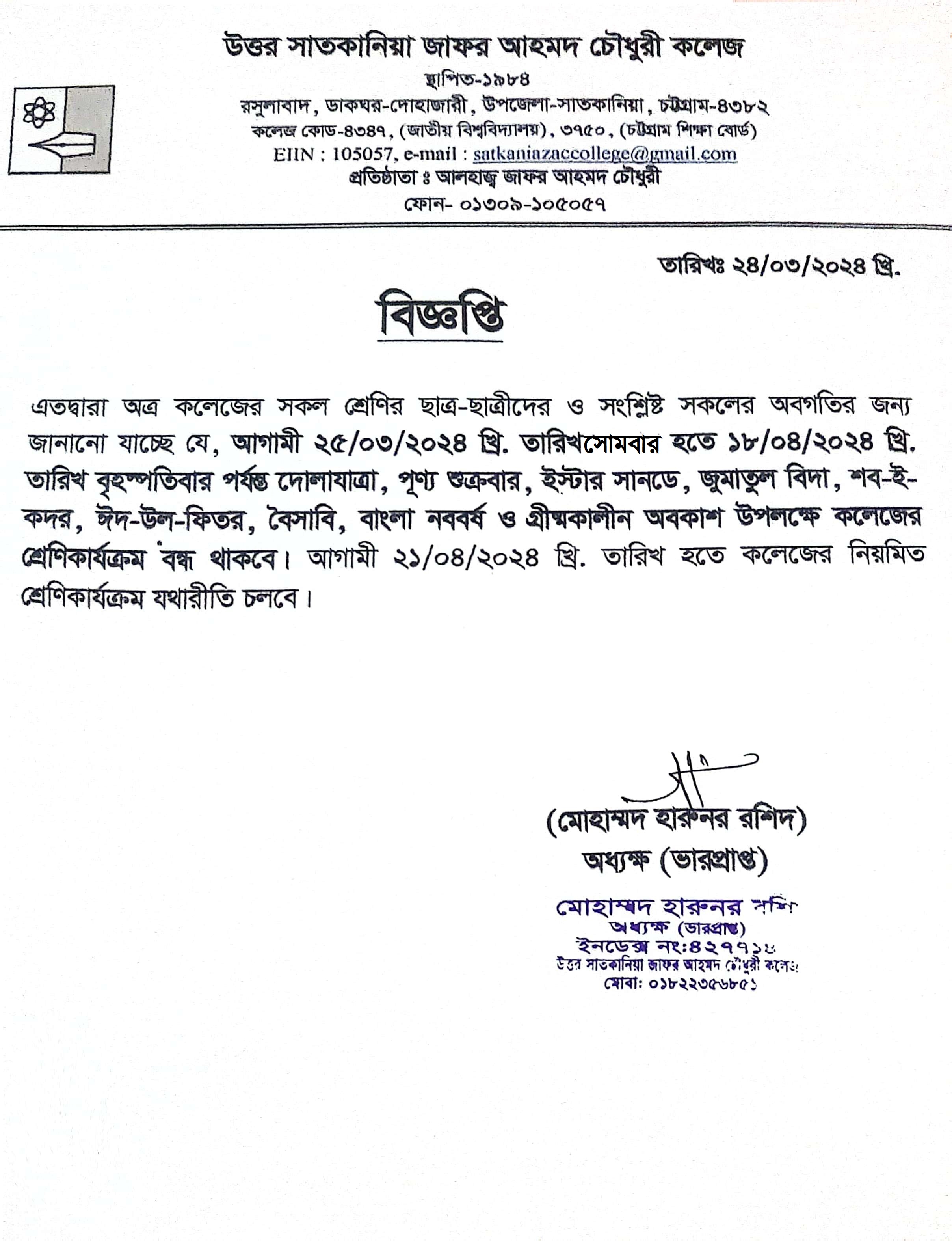 03/24/2024 অত্র কলেজের সকল শ্রেণী কার্যক্রম বন্ধ প্রসঙ্গে। ঈদ ও গ্রীষ্মকালীন ছুটি।