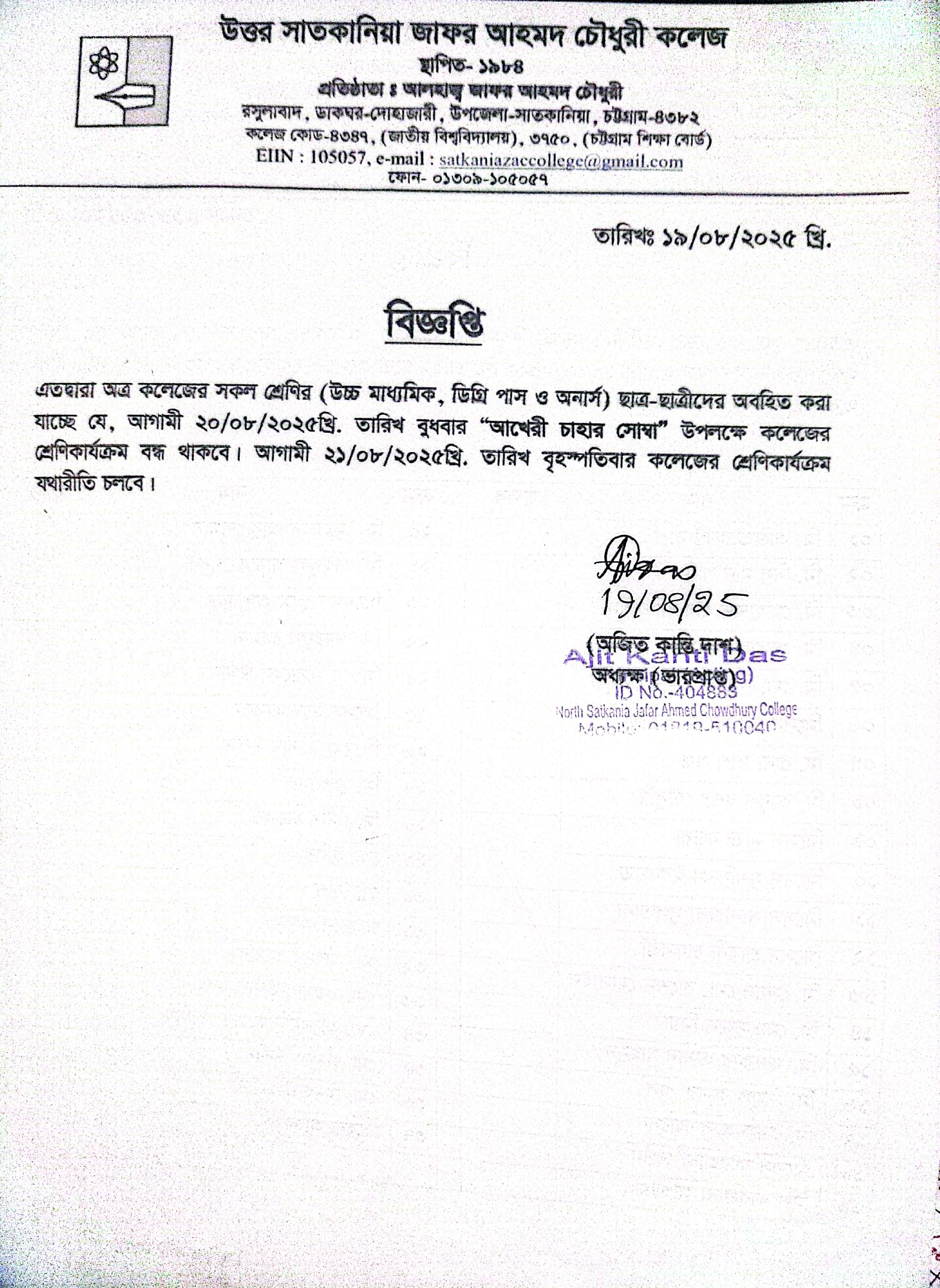 08/19/2025 আখেরী চাহার সোম্বা উপলক্ষে কলেজের শ্রেণীকার্যক্রম বন্ধ প্রসঙ্গে