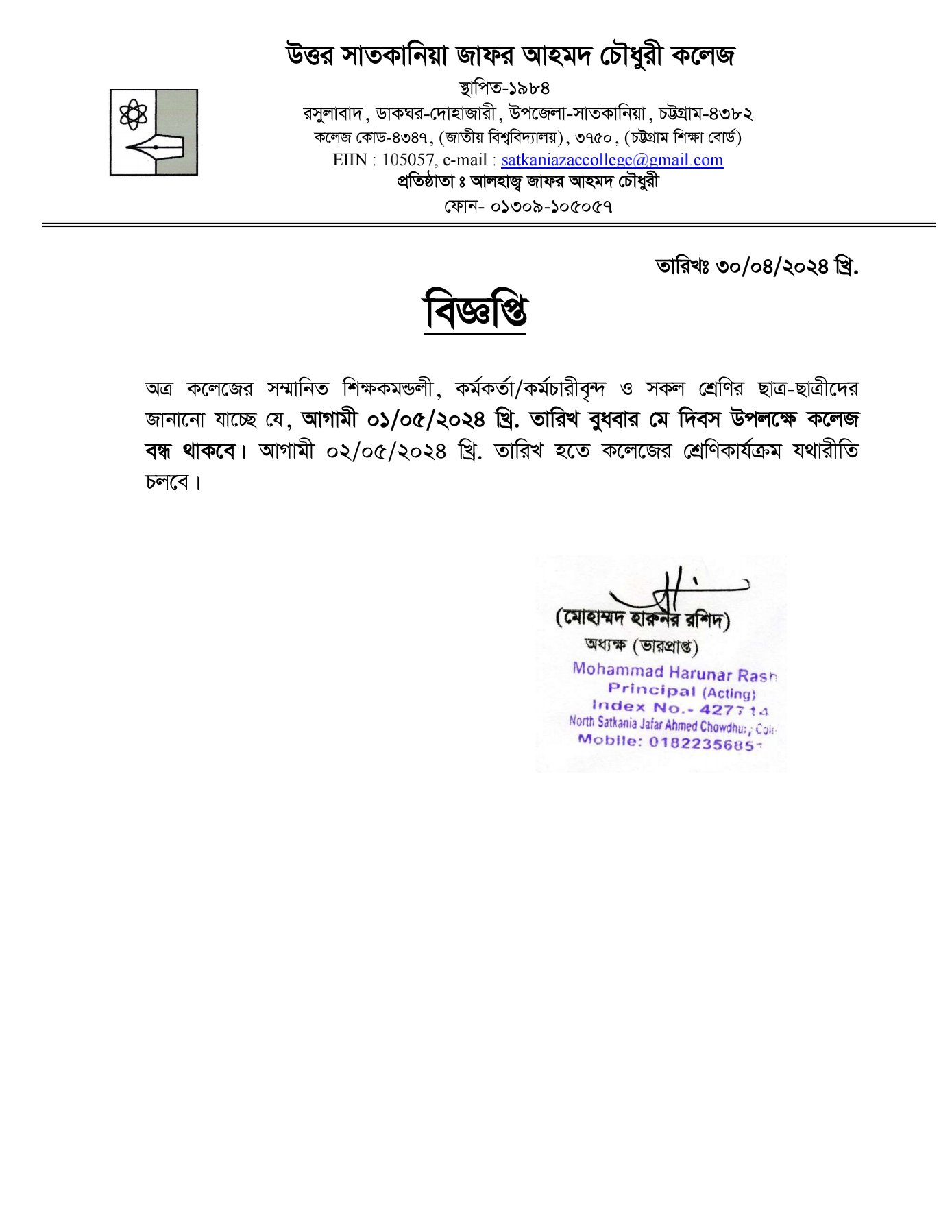 04/30/2024 মে দিবস উপলক্ষে কলেজ বন্ধের নোটিশ
